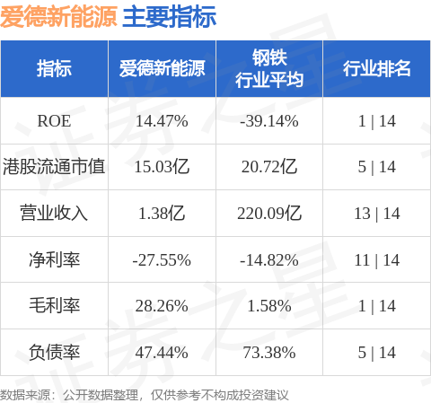 爱德新能源港股市值15.03亿港元,在钢铁行业中排名第5。主要指标见下表: