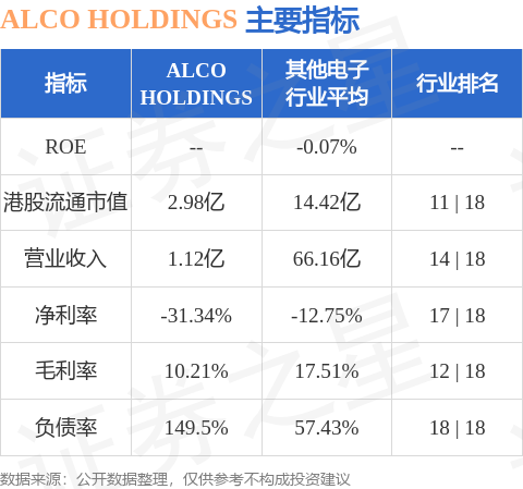 ALCO HOLDINGS港股市值2.98亿港元,在其他电子行业中排名第11。主要指标见下表:
