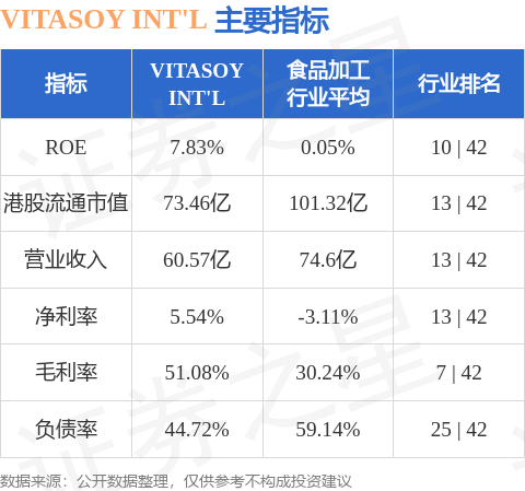 VITASOY INT'L港股市值73.46亿港元,在食品加工行业中排名第13。主要指标见下表: