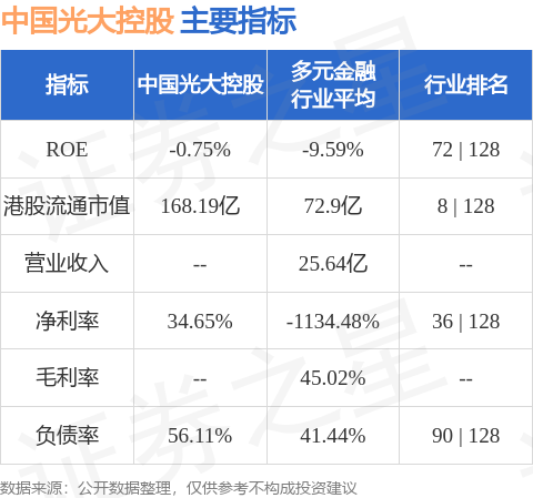 中国光大控股港股市值168.19亿港元,在多元金融行业中排名第8。主要指标见下表: