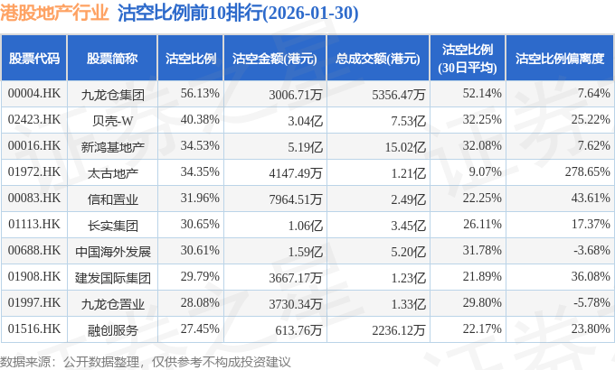 从沽空比例来看,九龙仓集团、贝壳-W、新鸿基地产沽空比例位居行业前三,分别为56.13%、40.38%、34.53%。