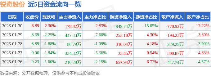 证券之星消息,截至2026年1月30日收盘,锐奇股份(300126)报收于8.89元,上涨2.3%,换手率3.39%,成交量7.14万手,成交额6308.89万元。