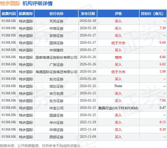 截至2026年1月30日收盘,特步国际(01368.HK)报收于5.14港元,下跌3.2%,成交量1347.1万股,成交额6903.75万港元。投行对该股的评级以买入为主,近90天内共有12家投行给出买入评级,近90天的目标均价为7.18港元。天风证券最新一份研报给予特步国际买入评级。