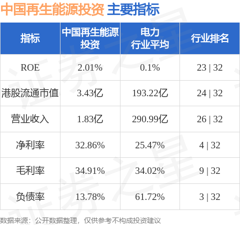 中国再生能源投资港股市值3.43亿港元,在电力行业中排名第24。主要指标见下表: