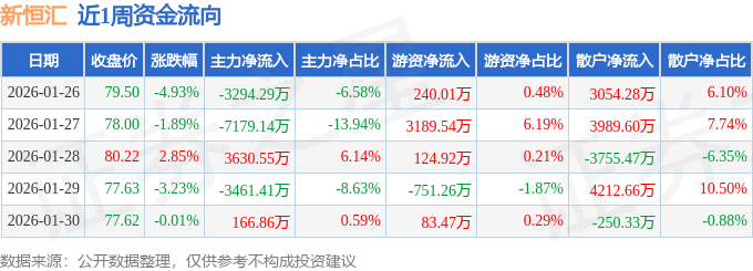 资金流向数据方面,本周新恒汇主力资金合计净流出1.01亿元,游资资金合计净流入2886.68万元,散户资金合计净流入7250.75万元。本周资金流向一览见下表: