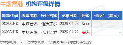 投行对该股的评级以买入为主,近90天内共有1家投行给出买入评级。信达证券最新一份研报给予中烟香港None评级。