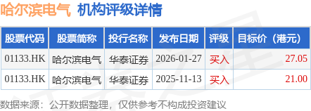 投行对该股的评级以买入为主,近90天内共有2家投行给出买入评级,近90天的目标均价为24.02港元。华泰证券最新一份研报给予哈尔滨电气买入评级,目标价27.05港元。