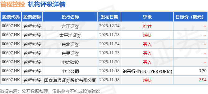 投行对该股的评级以买入为主,近90天内共有3家投行给出买入评级,近90天的目标均价为3.12港元。方正证券最新一份研报给予首程控股推荐评级。