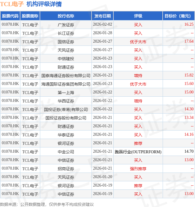 投行对该股的评级以买入为主,近90天内共有13家投行给出买入评级,近90天的目标均价为14.8港元。广发证券最新一份研报给予TCL电子买入评级,目标价16.25港元。
