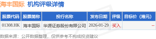 截至2026年2月3日收盘,海丰国际(01308.HK)报收于30.18港元,上涨4.28%,成交量679.59万股,成交额2.03亿港元。投行对该股的评级以买入为主,近90天内共有1家投行给出买入评级。华源证券股份有限公司最新一份研报给予海丰国际买入评级。
