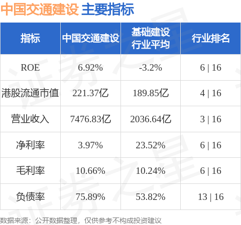 中国交通建设港股市值221.37亿港元,在基础建设行业中排名第4。主要指标见下表:
