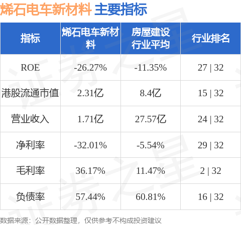 烯石电车新材料港股市值2.31亿港元,在房屋建设行业中排名第15。主要指标见下表: