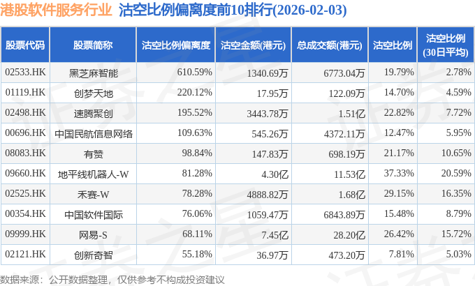 从沽空比例偏离度来看,黑芝麻智能、创梦天地、速腾聚创沽空比例偏离度位居行业前三,分别为610.59%、220.12%、195.52%。