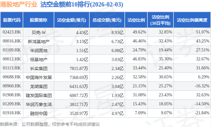 从沽空金额来看,贝壳-W、新鸿基地产、华润置地沽空金额位居行业前三,分别为4.43亿港元、3.13亿港元、1.51亿港元。