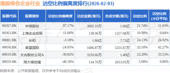 从沽空比例偏离度来看,中信股份、上海实业控股、长和沽空比例偏离度位居行业前三,分别为97.17%、11.6%、-3.18%。