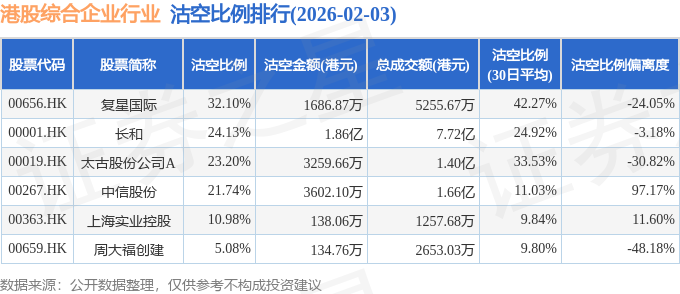 从沽空比例来看,复星国际、长和、太古股份公司A沽空比例位居行业前三,分别为32.1%、24.13%、23.2%。