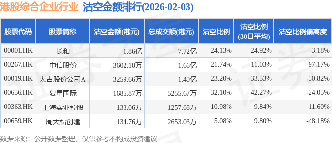 从沽空金额来看,长和、中信股份、太古股份公司A沽空金额位居行业前三,分别为1.86亿港元、3602.1万港元、3259.66万港元。