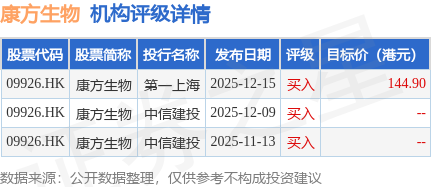 截至2026年2月3日收盘,康方生物(09926.HK)报收于100.9港元,与上一交易日持平,成交量714.12万股,成交额7.13亿港元。投行对该股的评级以买入为主,近90天内共有3家投行给出买入评级,近90天的目标均价为144.9港元。第一上海最新一份研报给予康方生物买入评级,目标价144.9港元。