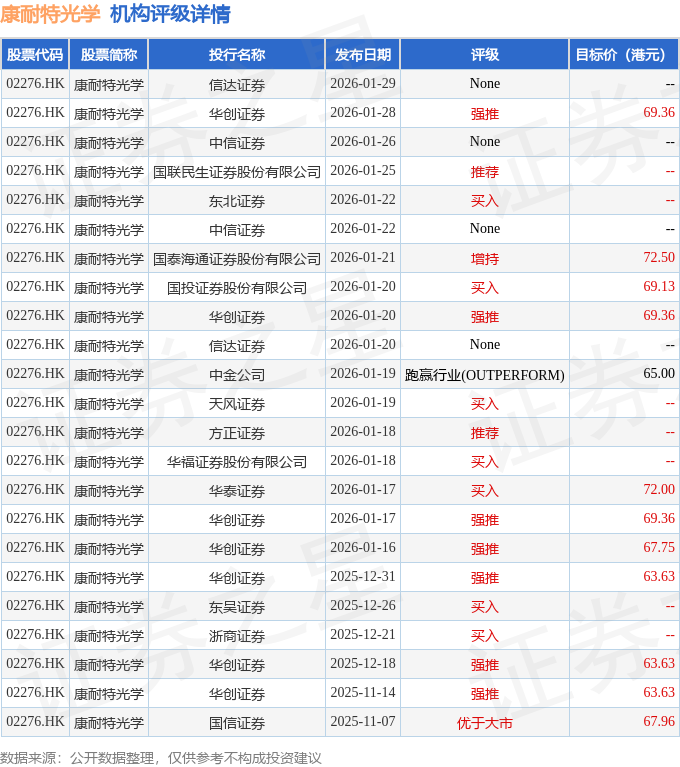 截至2026年2月3日收盘,康耐特光学-一百(02276.HK)报收于61.9港元,上涨0.73%,成交量153.22万股,成交额9563.07万港元。投行对该股的评级以强推为主,近90天内共有7家投行给出强推评级,近90天的目标均价为67.78港元。信达证券最新一份研报给予康耐特光学None评级。