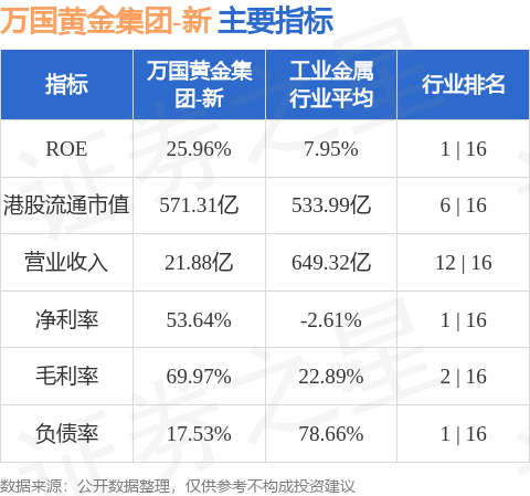 万国黄金集团-新港股市值571.31亿港元,在工业金属行业中排名第6。主要指标见下表: