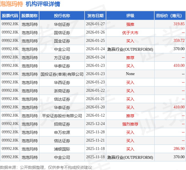 投行对该股的评级以买入为主,近90天内共有9家投行给出买入评级,近90天的目标均价为360.92港元。华创证券最新一份研报给予泡泡玛特强推评级,目标价319.85港元。