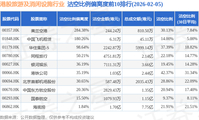 从沽空比例偏离度来看,美兰空港、中国飞机租赁、华住集团-S沽空比例偏离度位居行业前三,分别为284.38%、180.26%、98.64%。
