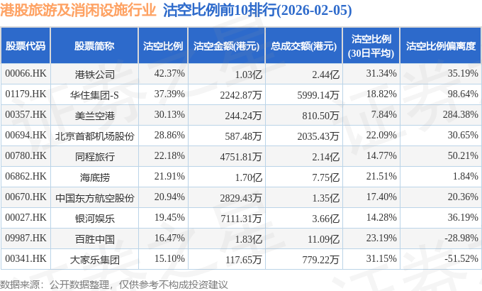 从沽空比例来看,港铁公司、华住集团-S、美兰空港沽空比例位居行业前三,分别为42.37%、37.39%、30.13%。