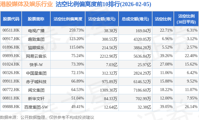 从沽空比例偏离度来看,电视广播、趣致集团、猫眼娱乐沽空比例偏离度位居行业前三,分别为259.73%、123.2%、115.04%。