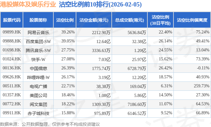从沽空比例来看,网易云音乐、百度集团-SW、腾讯音乐-SW沽空比例位居行业前三,分别为39.26%、39.05%、27.75%。