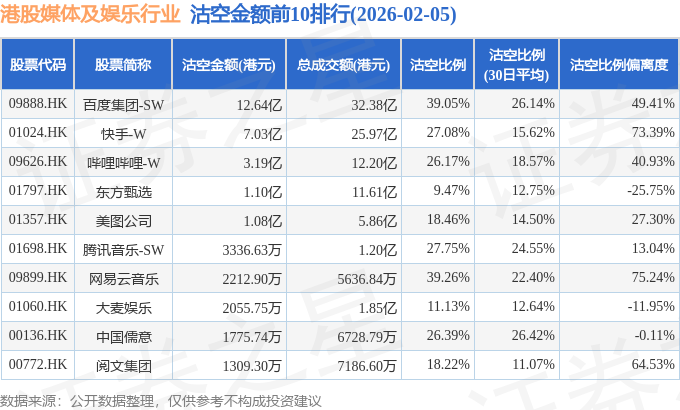 从沽空金额来看,百度集团-SW、快手-W、哔哩哔哩-W沽空金额位居行业前三,分别为12.64亿港元、7.03亿港元、3.19亿港元。