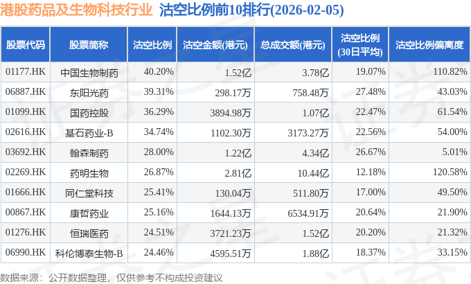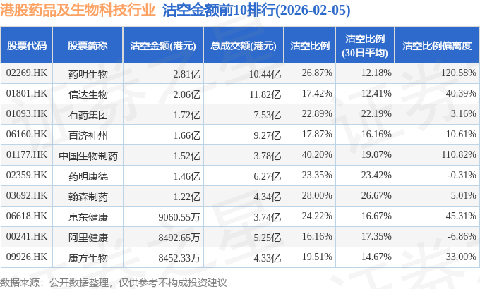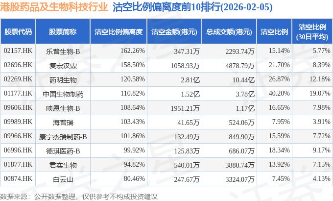 从沽空比例偏离度来看,乐普生物-B、复宏汉霖、药明生物沽空比例偏离度位居行业前三,分别为162.26%、158.5%、120.58%。