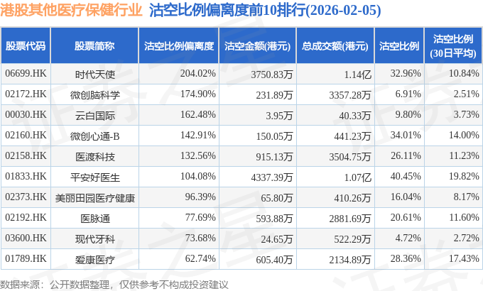 从沽空比例偏离度来看,时代天使、微创脑科学、云白国际沽空比例偏离度位居行业前三,分别为204.02%、174.9%、162.48%。