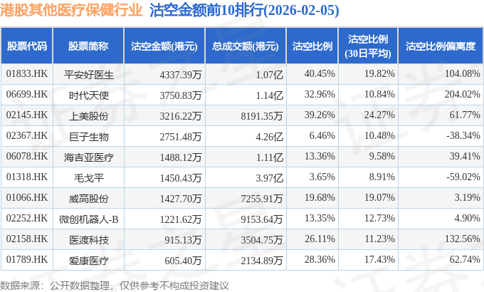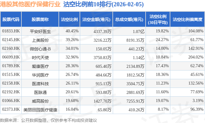 从沽空比例来看,平安好医生、上美股份、微创心通-B沽空比例位居行业前三,分别为40.45%、39.26%、34.01%。