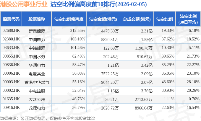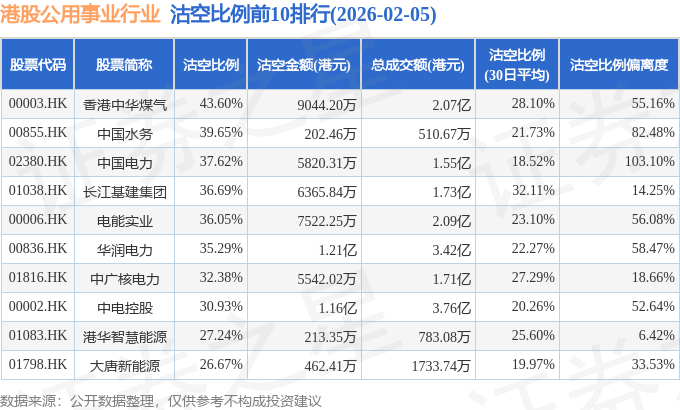 从沽空比例来看,香港中华煤气、中国水务、中国电力沽空比例位居行业前三,分别为43.6%、39.65%、37.62%。