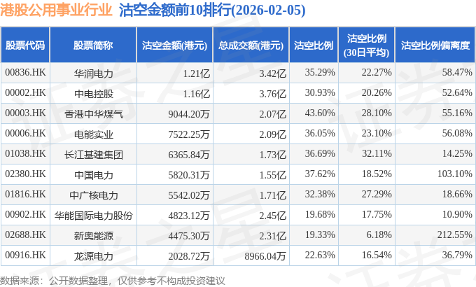 从沽空金额来看,华润电力、中电控股、香港中华煤气沽空金额位居行业前三,分别为1.21亿港元、1.16亿港元、9044.2万港元。