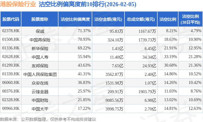 从沽空比例偏离度来看,保诚、中国再保险、新华保险沽空比例偏离度位居行业前三,分别为71.37%、70.93%、69.22%。