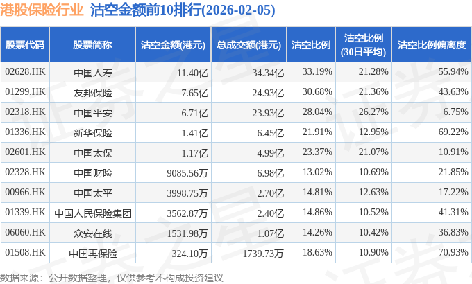 从沽空比例来看,中国人寿、友邦保险、中国平安沽空比例位居行业前三,分别为33.19%、30.68%、28.04%。