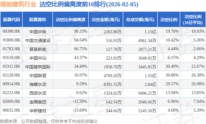 从沽空比例来看,中国联塑、中国建筑国际、海螺水泥沽空比例位居行业前三,分别为30.86%、30.49%、29.57%。