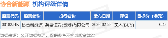 投行对该股的评级以买入(BUY)为主,近90天内共有1家投行给出买入(BUY)评级,近90天的目标均价为0.45港元。英皇证券(香港)有限公司最新一份研报给予协合新能源买入(BUY)评级,目标价0.45港元。