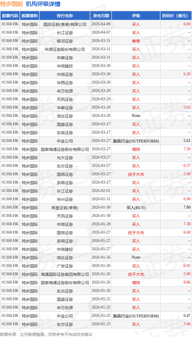 投行对该股的评级以买入为主,近90天内共有26家投行给出买入评级,近90天的目标均价为6.68港元。国投证券(香港)有限公司最新一份研报给予特步国际买入评级,目标价6.6港元。