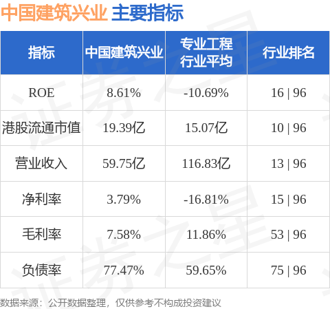 中国建筑兴业港股市值19.39亿港元,在专业工程行业中排名第10。主要指标见下表: