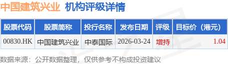 投行对该股的评级以增持为主,近90天内共有1家投行给出增持评级,近90天的目标均价为1.04港元。中泰国际最新一份研报给予中国建筑兴业增持评级,目标价1.04港元。
