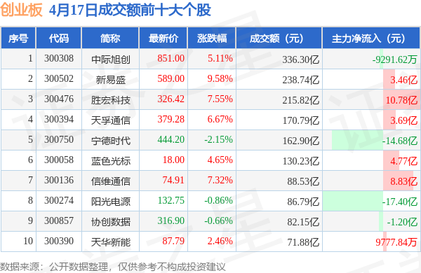 4月17日创业板成交额前十大个股,中际旭创(300308)居首