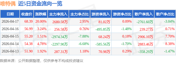 证券之星消息,唯特偶4月17日涨停收盘,收盘价68.39元。该股于13点10分涨停,5次打开涨停,截止收盘封单资金为6047.91万元,占其流通市值0.95%。