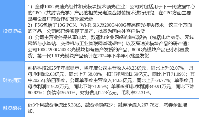 该股为光电共封装CPO,光通信,F5G概念热股,当日光电共封装CPO概念上涨5.02%,光通信概念上涨4.18%,F5G概念上涨3.74%。
