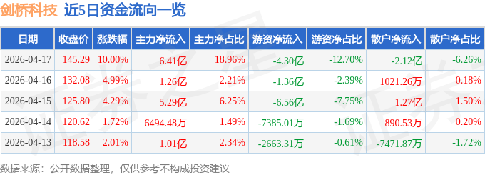4月17日的资金流向数据方面,主力资金净流入6.41亿元,占总成交额18.96%,游资资金净流出4.3亿元,占总成交额12.7%,散户资金净流出2.12亿元,占总成交额6.26%。