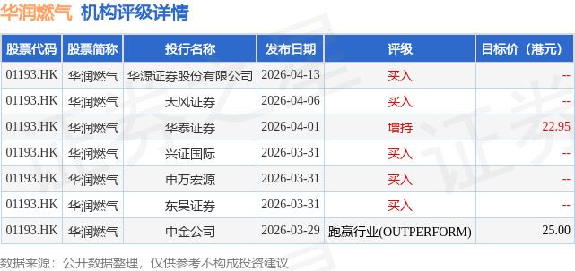 截至2026年4月17日收盘,华润燃气(01193.HK)报收于18.8港元,下跌0.58%,成交量407.34万股,成交额7637.72万港元。投行对该股的评级以买入为主,近90天内共有5家投行给出买入评级,近90天的目标均价为23.98港元。华源证券股份有限公司最新一份研报给予华润燃气买入评级。