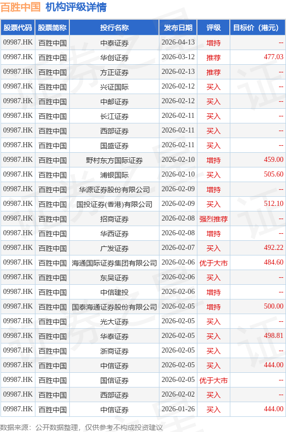 机构评级详情见下表: