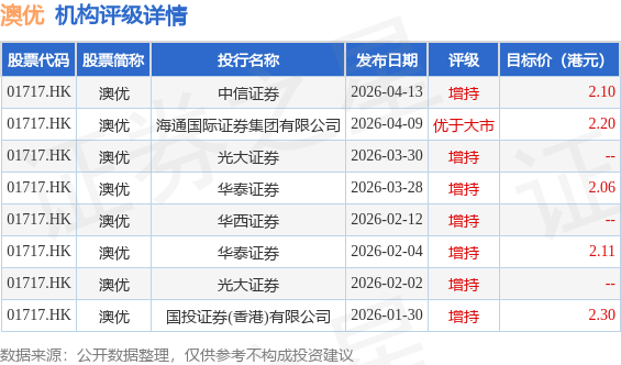 截至2026年4月17日收盘,澳优(01717.HK)报收于1.75港元,与上一交易日持平,成交量48.9万股,成交额85.08万港元。投行对该股的评级以增持为主,近90天内共有7家投行给出增持评级,近90天的目标均价为2.15港元。中信证券最新一份研报给予澳优增持评级,目标价2.1港元。