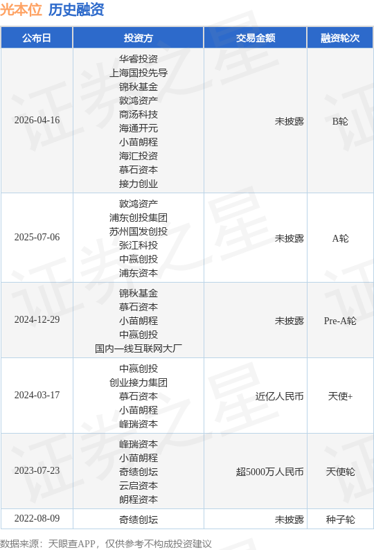 证券之星消息,根据天眼查APP于4月16日公布的信息整理,光本位智能科技(上海)有限公司B轮融资,融资额未披露,参与投资的机构包括华睿投资,上海国投先导,锦秋基金,敦鸿资产,商汤科技,海通开元,小苗朗程,海汇投资,慕石资本,接力创业。